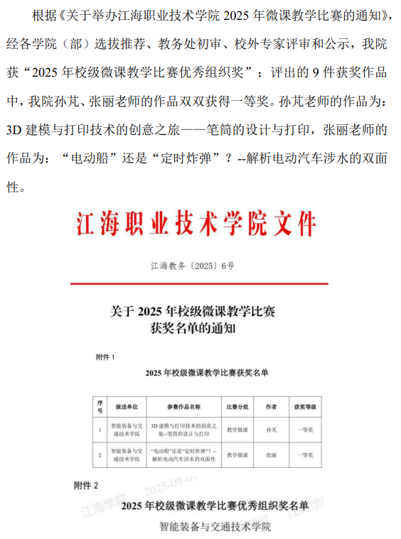 我院获“2025 年校级微课教学比赛优秀组织奖” 孙芃、张丽老师双双获得“2025 年校级微课教学比赛”一等奖