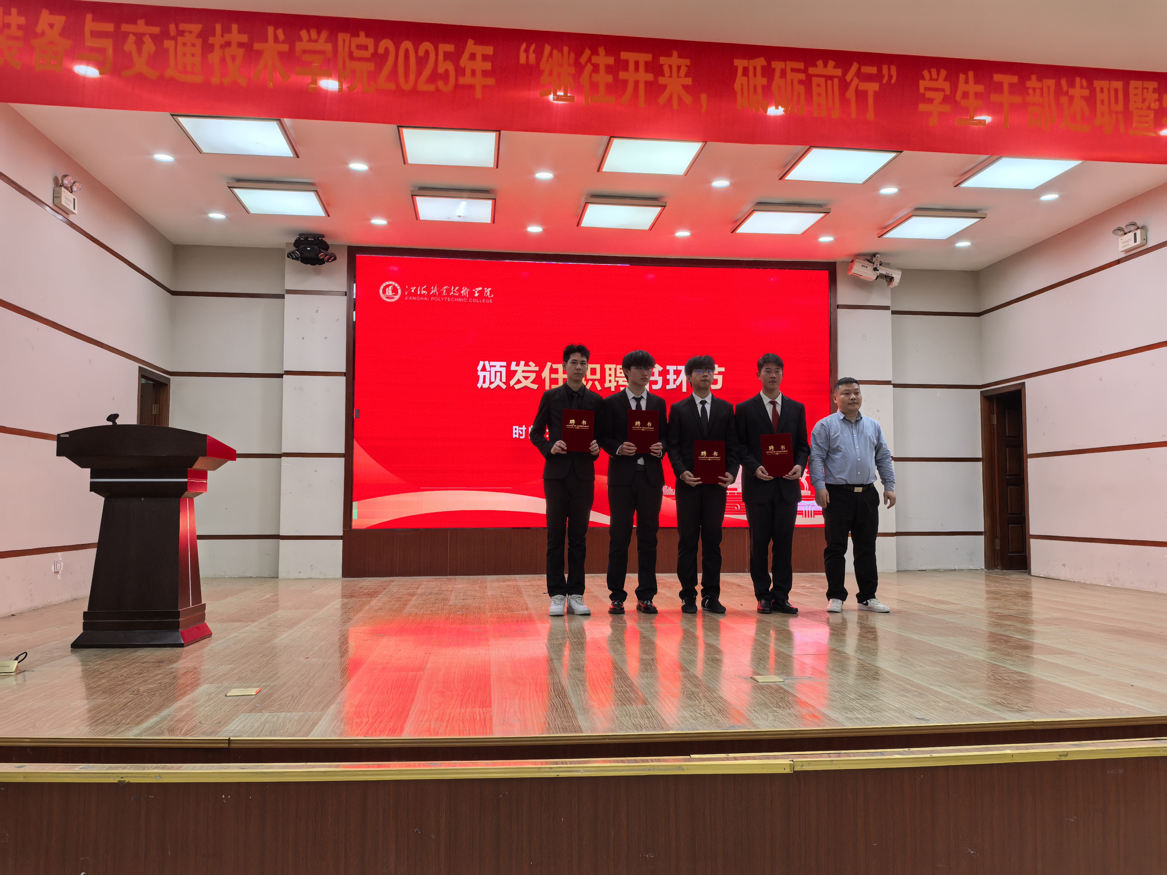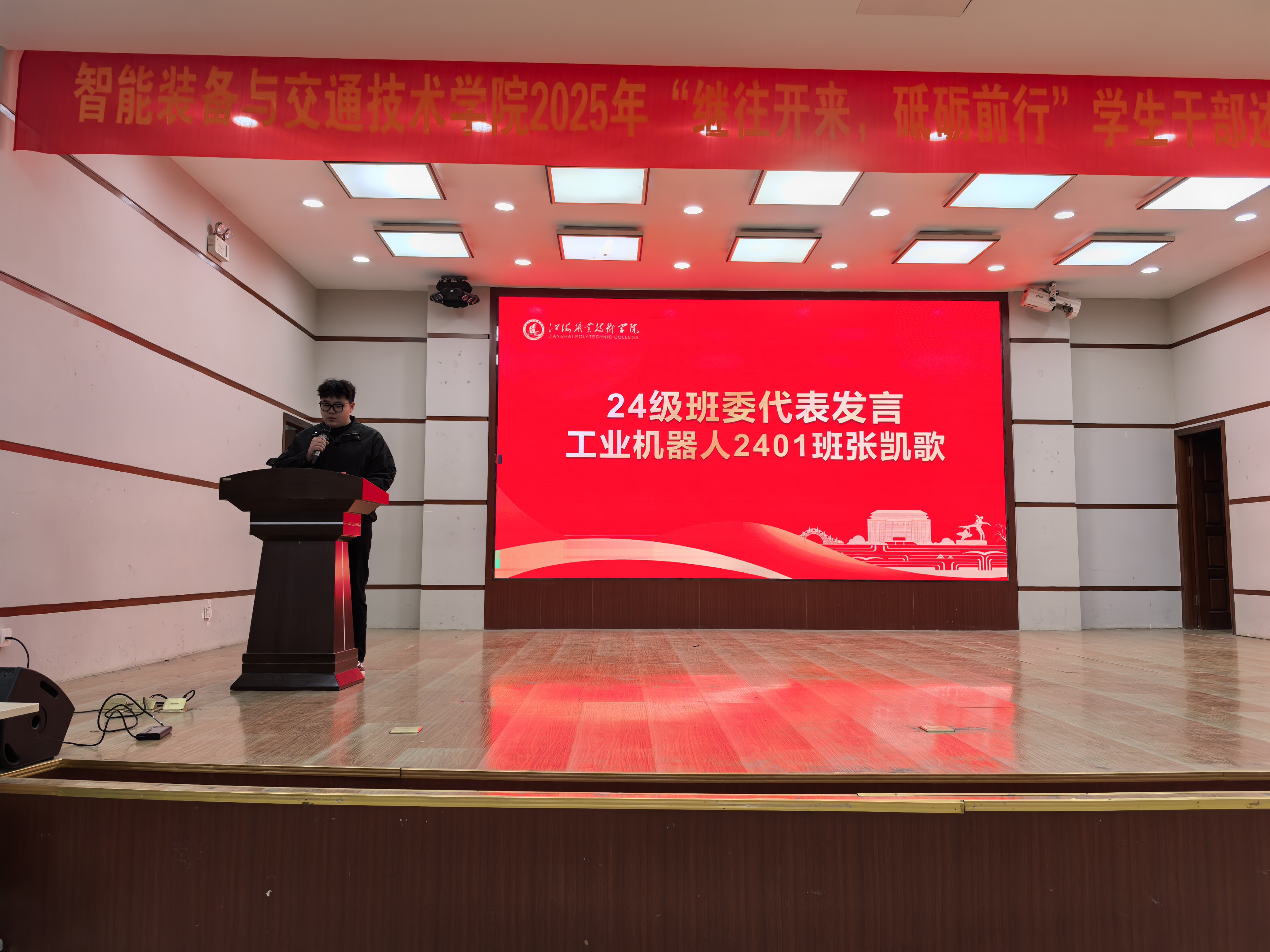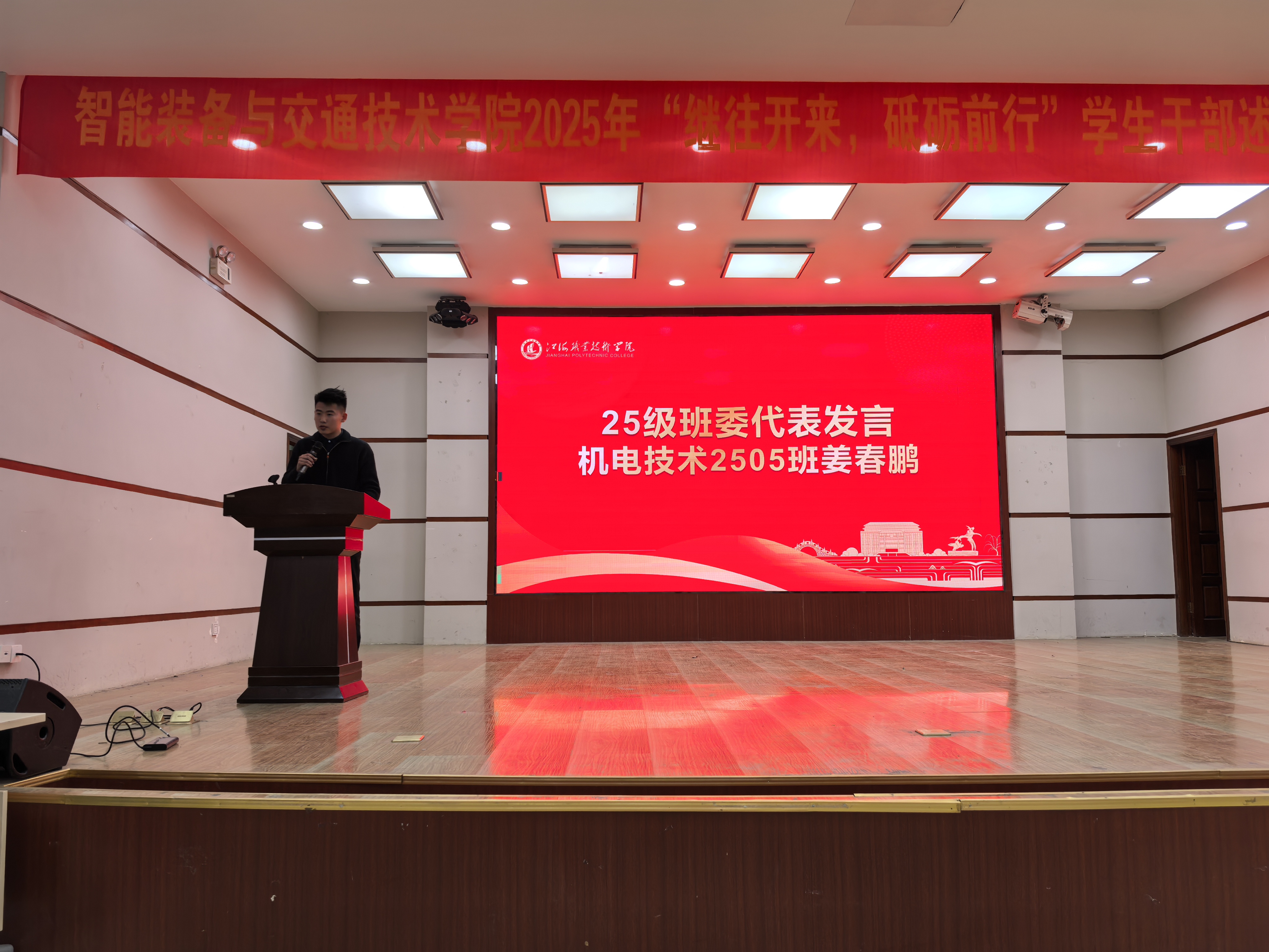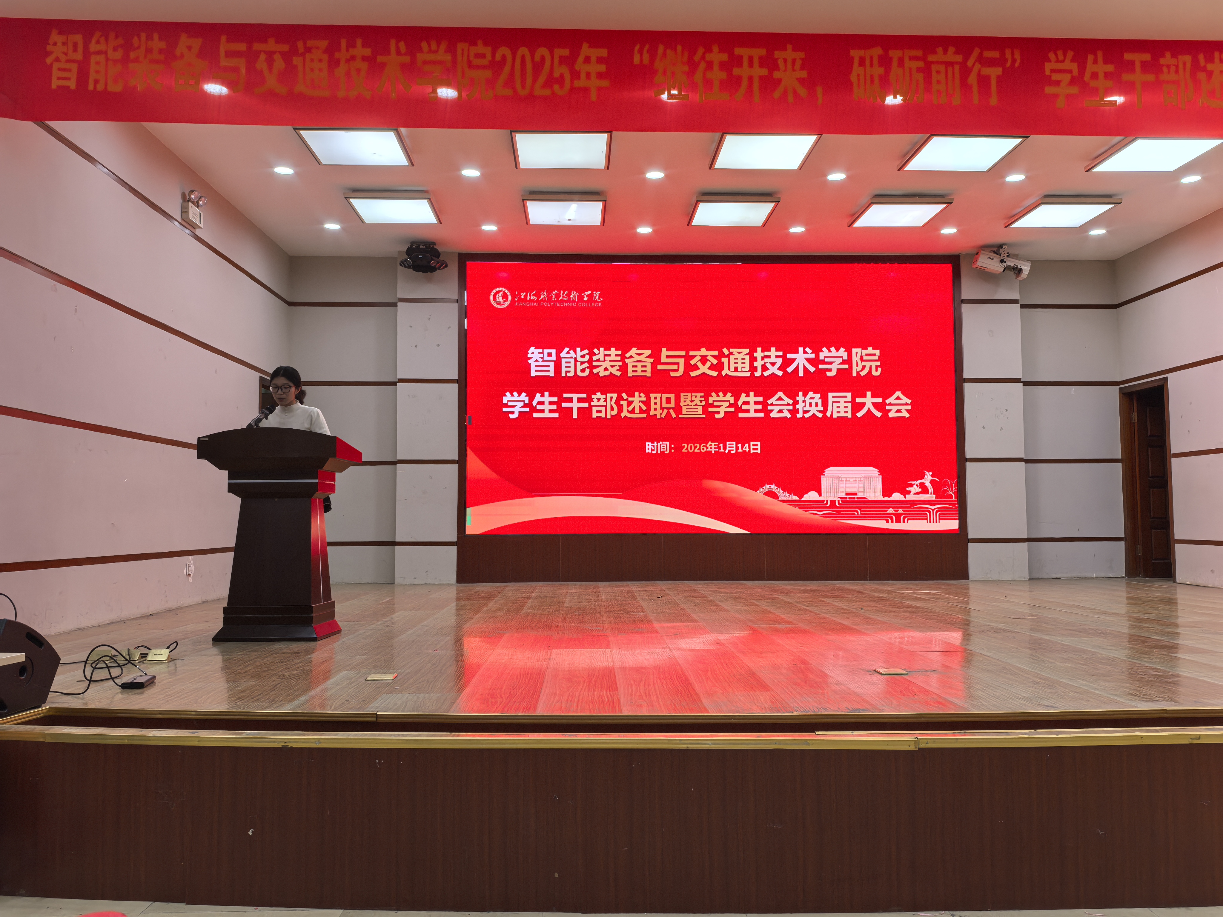 智能装备与交通技术学院于2026年1月14日在生活区报告厅隆重举行2025-2026学年学生干部述职暨学生会换届大会。学院党总支副书记孙波、学工办主任兼团总支书记戴智伟、团总支副书记吴希文、全体辅导员、24级25级班委代表、新任学生会干部出席会议。大会由团总支副书记吴希文主持。