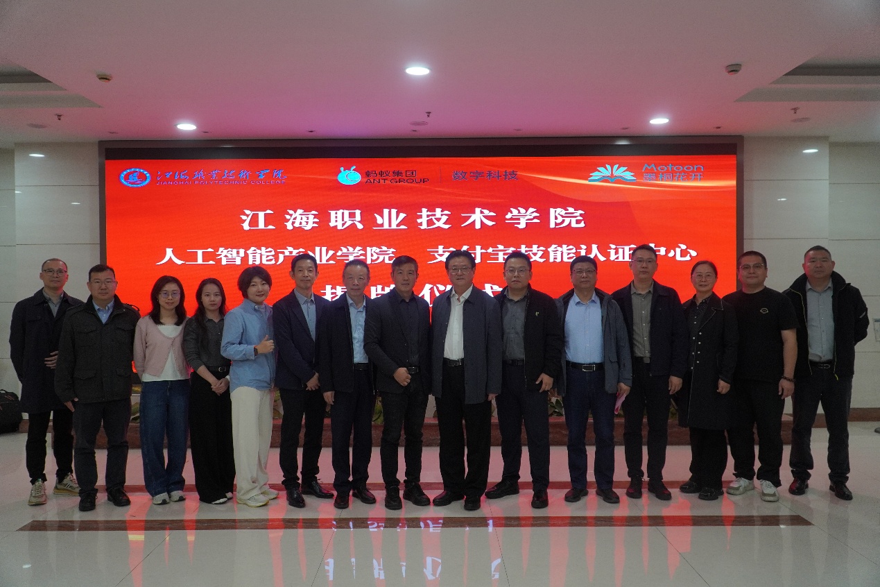 10月30日下午,江海职业技术学院与蚂蚁科技集团、上海墨桐花开教育科技有限公司联合共建的支付宝人工智能产业学院揭牌仪式,在学校图书馆六楼会议室举行。校长刘宏、副校长傅伟,蚂蚁集团副总裁何勇明、墨桐花开总经理胡昕亮及三方相关部门负责人出席活动。