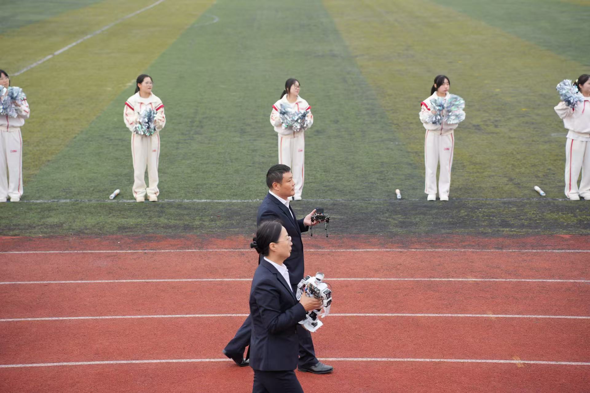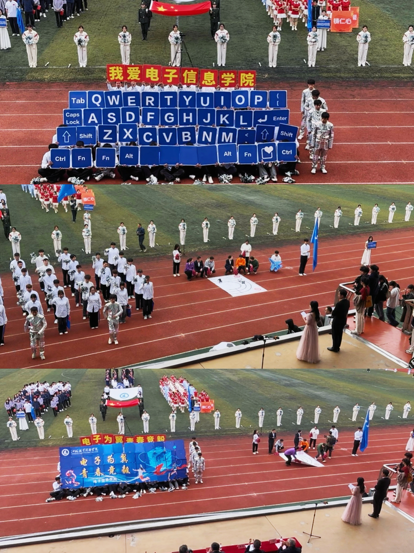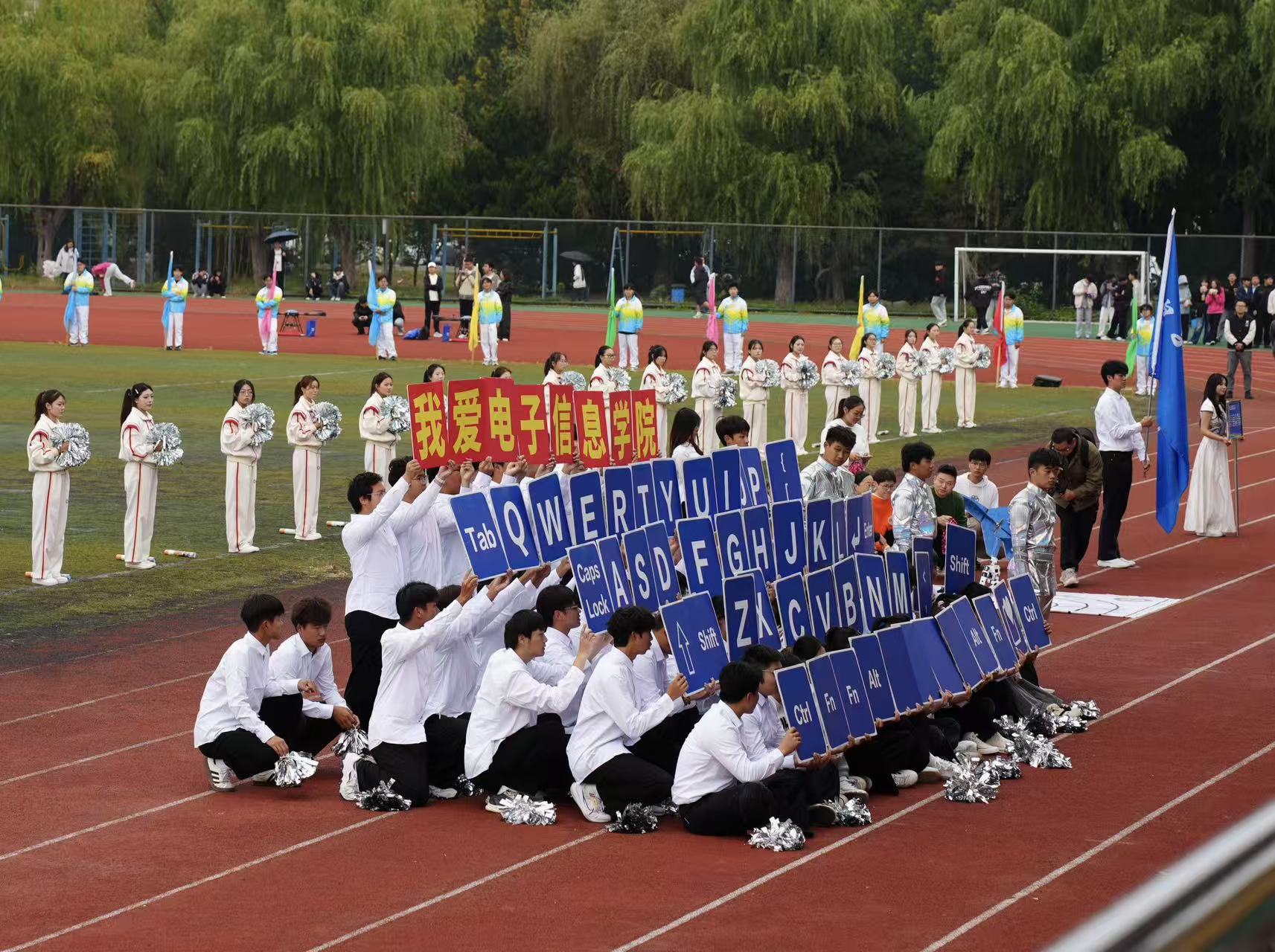 2025年10月30日上午,运动会开幕式正式拉开帷幕。学院方阵率先带来精彩亮相,学院院长任云辉、学工院长孙波带队前行,多位学院老师积极加入方阵行列,与运动员们一同迈着铿锵步伐。方阵前,小机器人灵动起舞,既呼应了学院人工智能等核心专业特色,也是机器人社团的创意呈现,更彰显出专业硬核实力。随后方阵变换为键盘造型,队员们依次站起如按键点亮,逐字拼出“我爱电子信息学院”,响亮口号与整齐起蹲动作中,满是“青春竞毅”的蓬勃力量。
