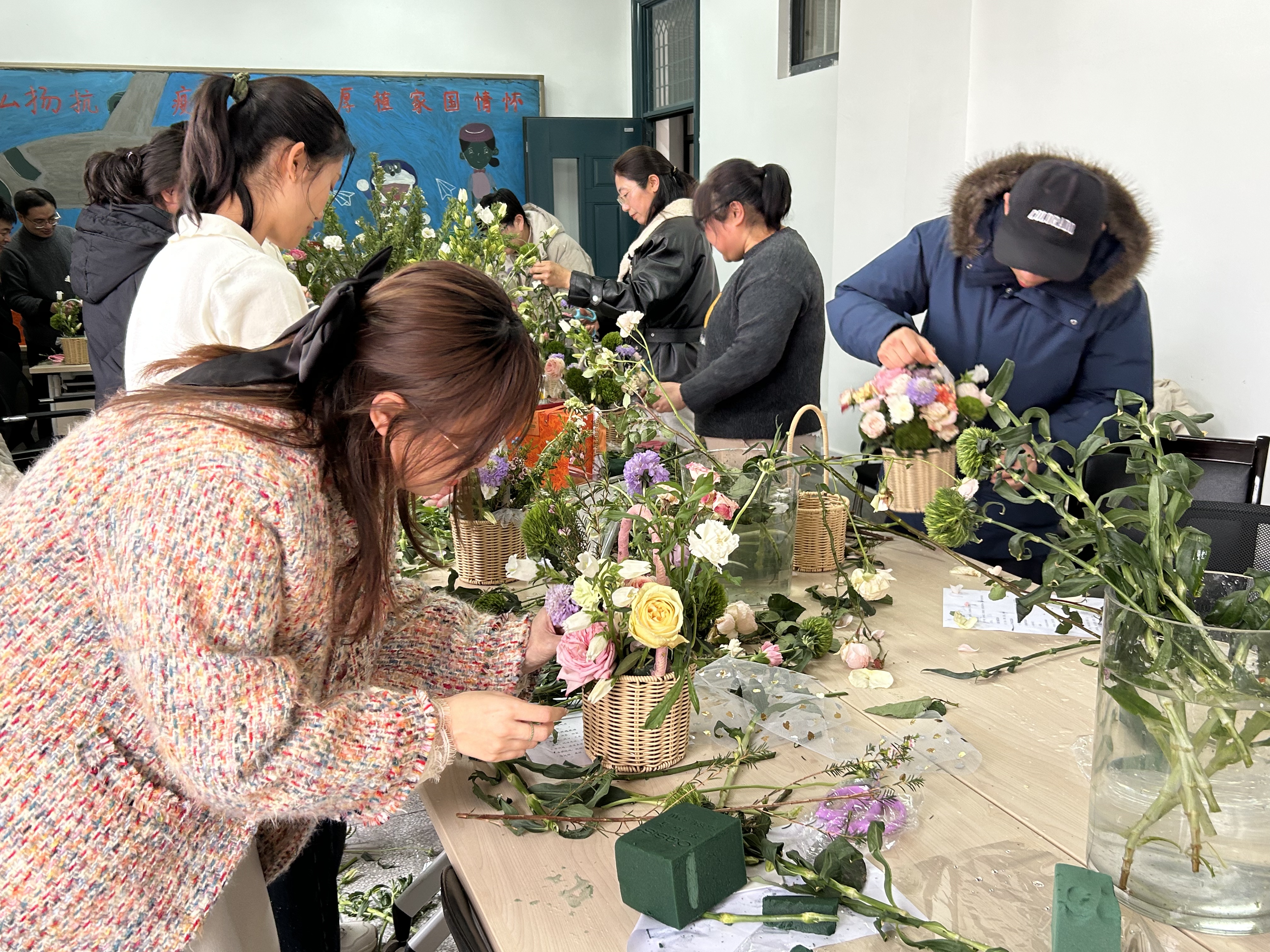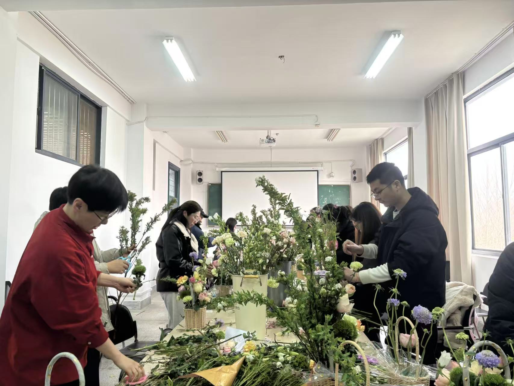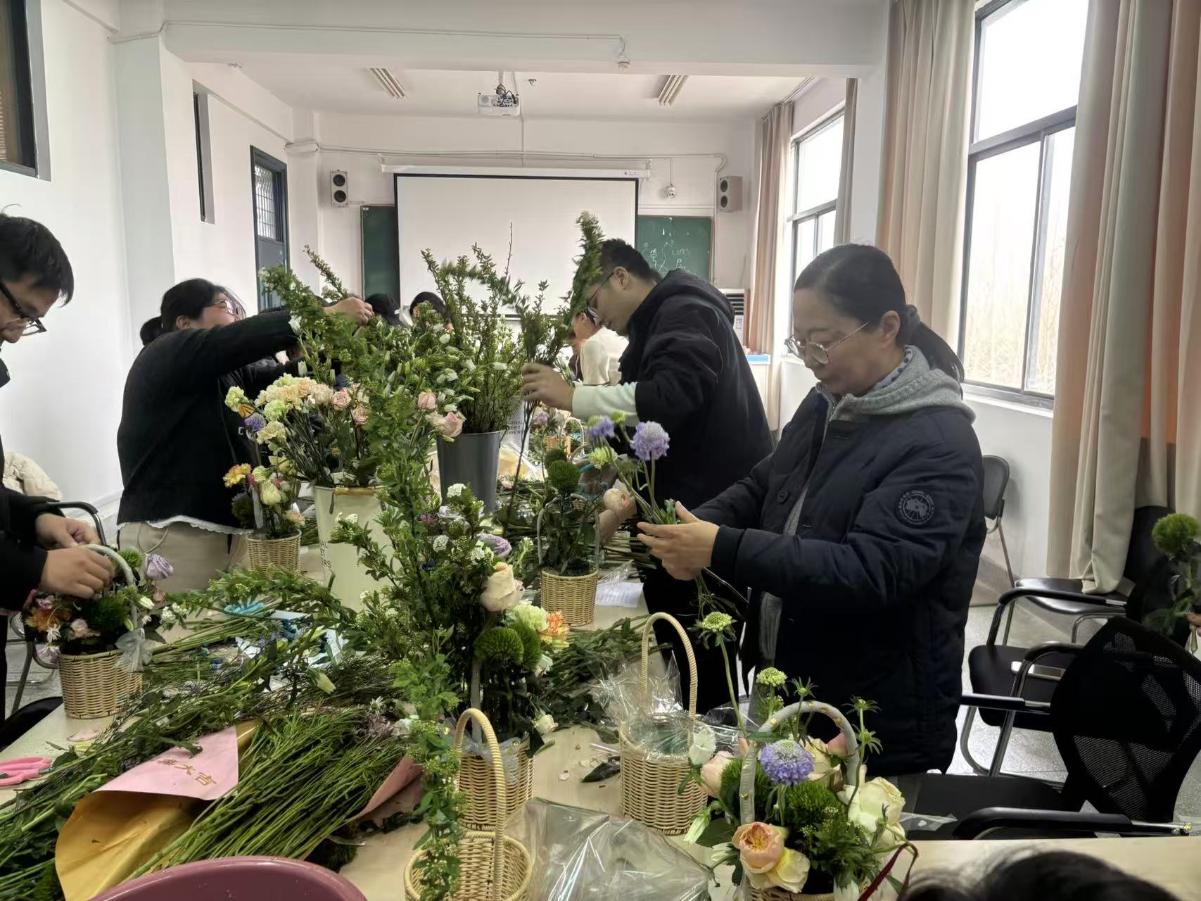 体态指导结束后,充满趣味与美感的园艺插花体验环节正式开启。活动现场,分工会提前准备了丰富的花材、剪刀、花篮等工具,插花老师介绍了构思造型、修剪花枝、搭配色彩的方法,教职工们纷纷动手创作,在轻松愉悦的氛围中将缤纷的鲜花巧妙组合,原本普通的花材在大家的巧手下变成了一件件独具匠心的插花作品。创作过程中,大家相互交流技巧、分享创意,现场欢声笑语不断,处处洋溢着温馨和谐的节日氛围。