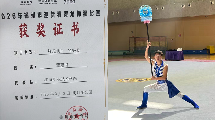 近日,由扬州市体育局主办的“2026年扬州市迎新春舞龙舞狮比赛”在明月湖公园圆满落幕,我院土木工程学院消防2401班董建岗同学代表江海职业技术学院参赛,凭借精湛“龙珠”技艺与出色表现,与团队成员荣获舞龙项目特等奖,为学校争得了荣誉。