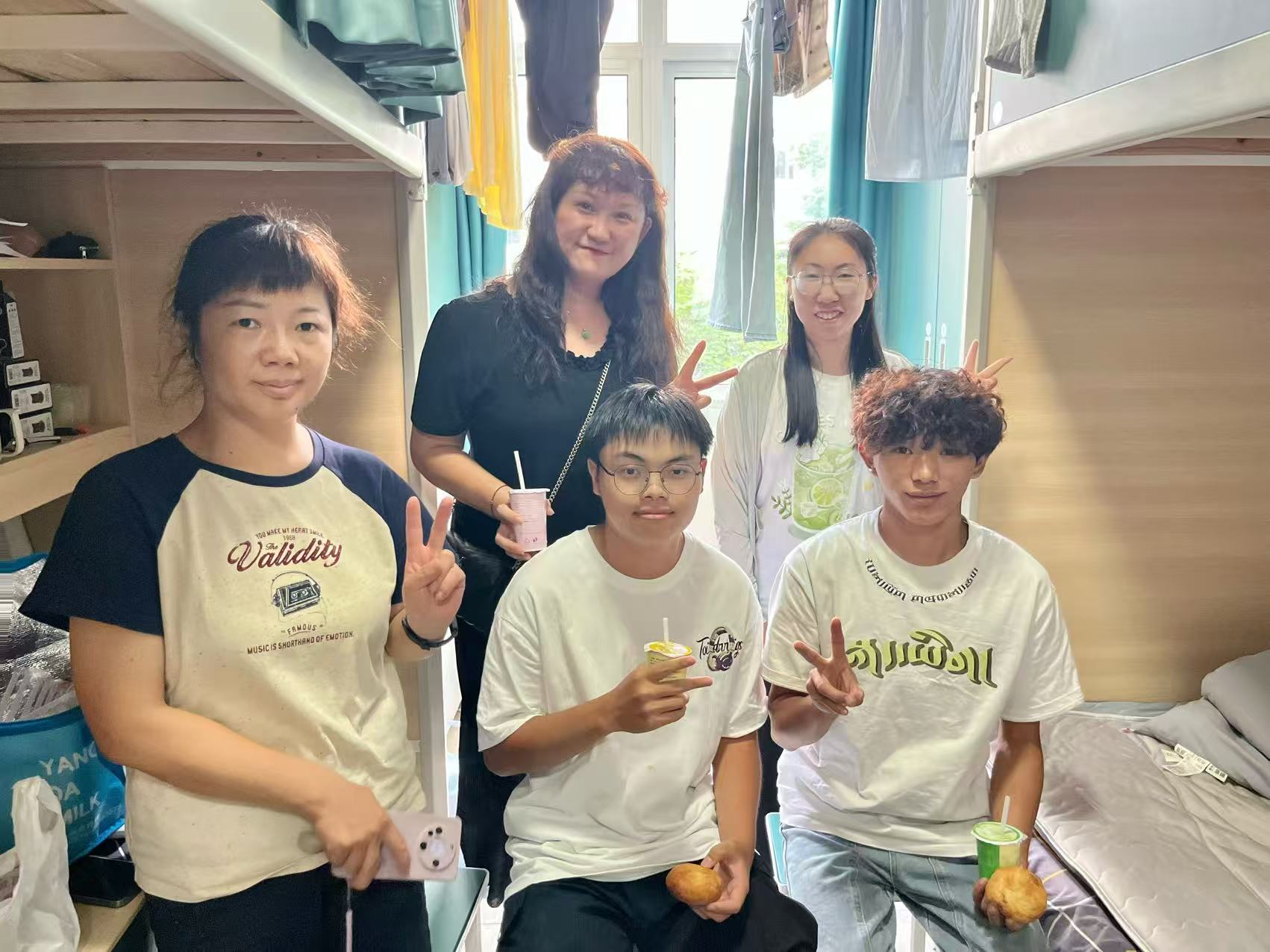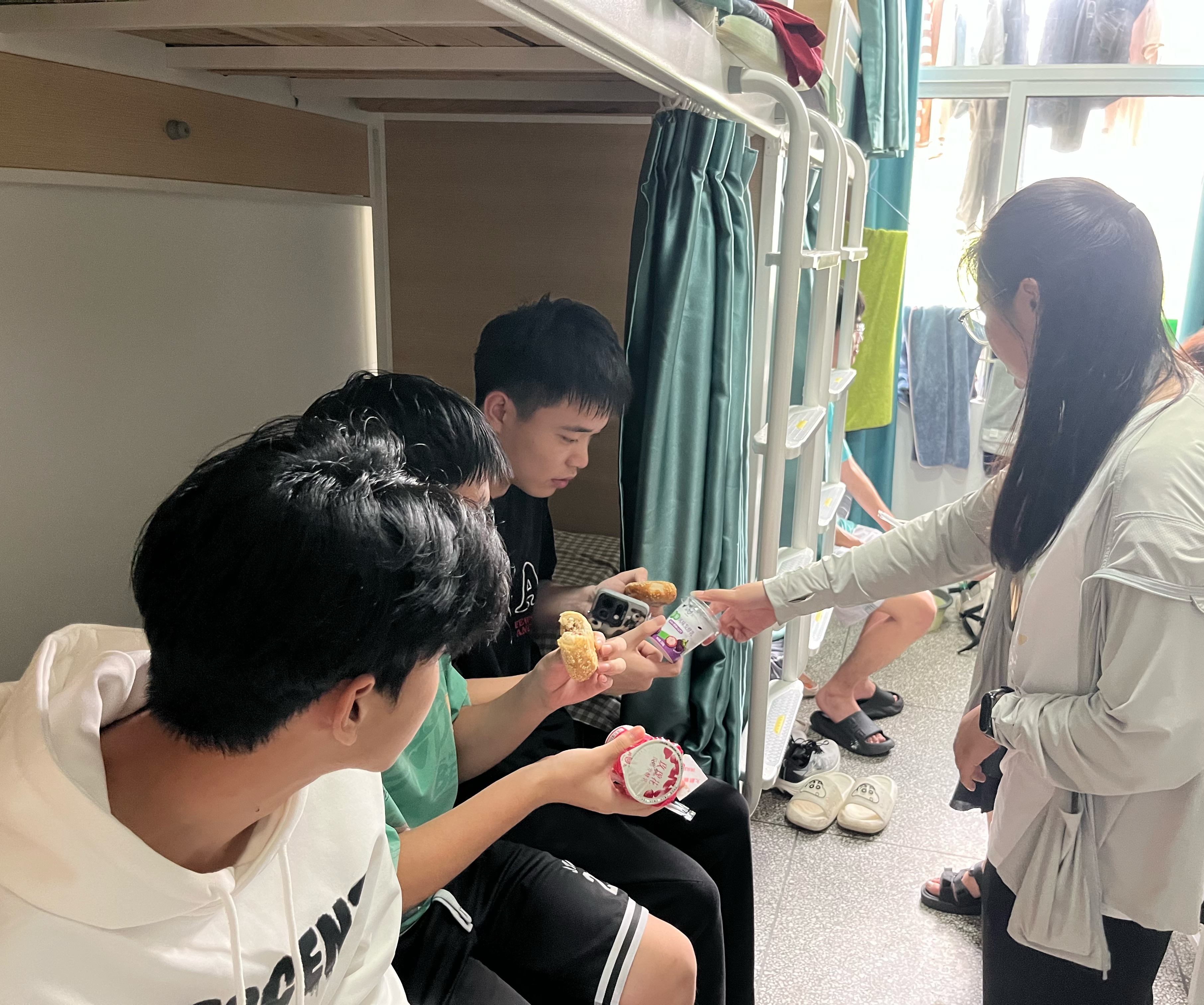 活动中,老师们携带扬州大麒麟阁月饼与茉莉花酸奶,逐间走访,在会计2404班西藏学生向巴云登的宿舍,老师们细致询问了饮食起居习惯与假期规划安排。这是向巴云登在校度过的第二个中秋,他表示“每年中秋,学院都记挂着我们,月饼甜、酸奶香,我们心里更暖。”师生们围坐在一起,如同家人闲话家常,从学业近况聊到家乡习俗,从校园生活谈到未来期许,浓浓的关爱在轻松交谈中悄然传递。