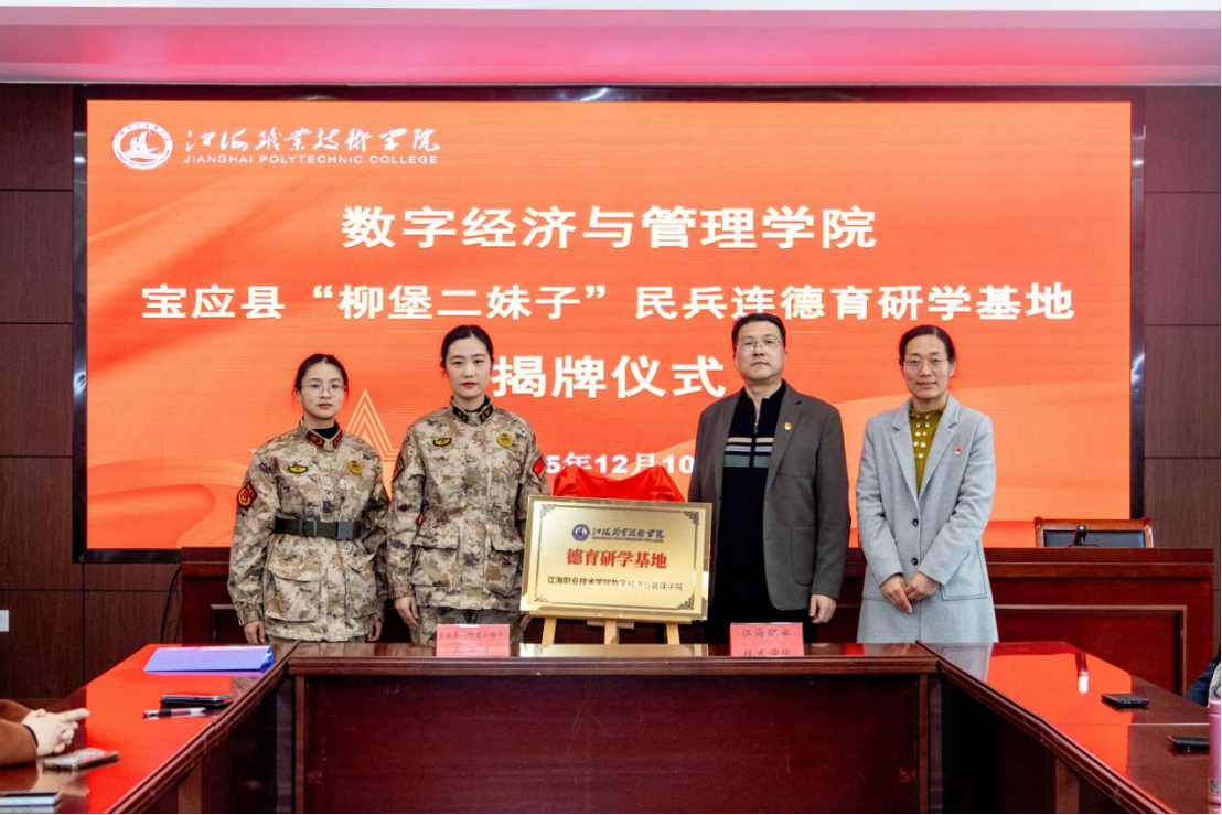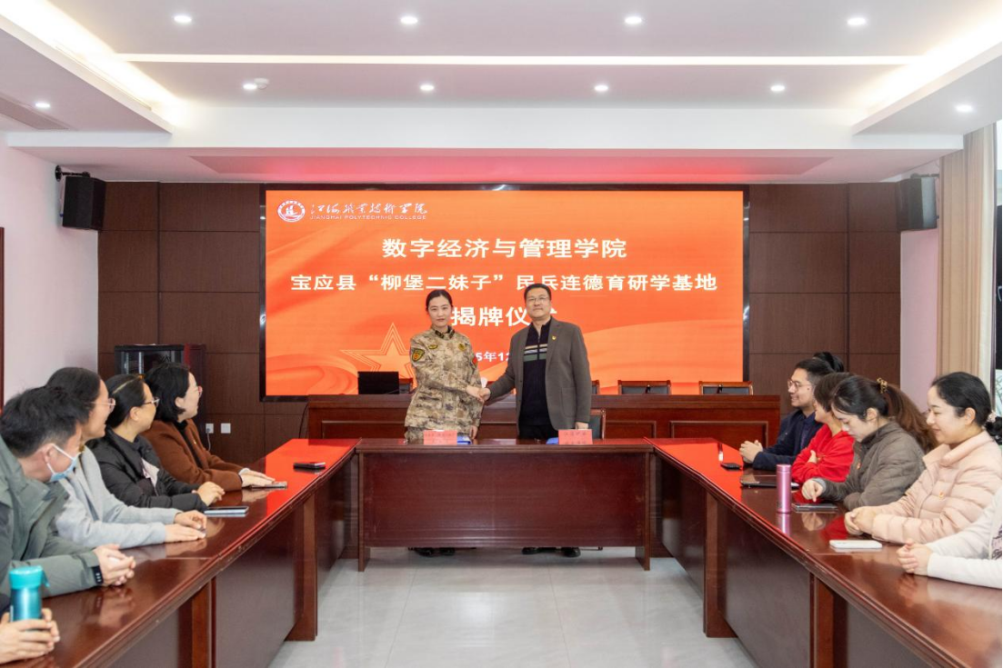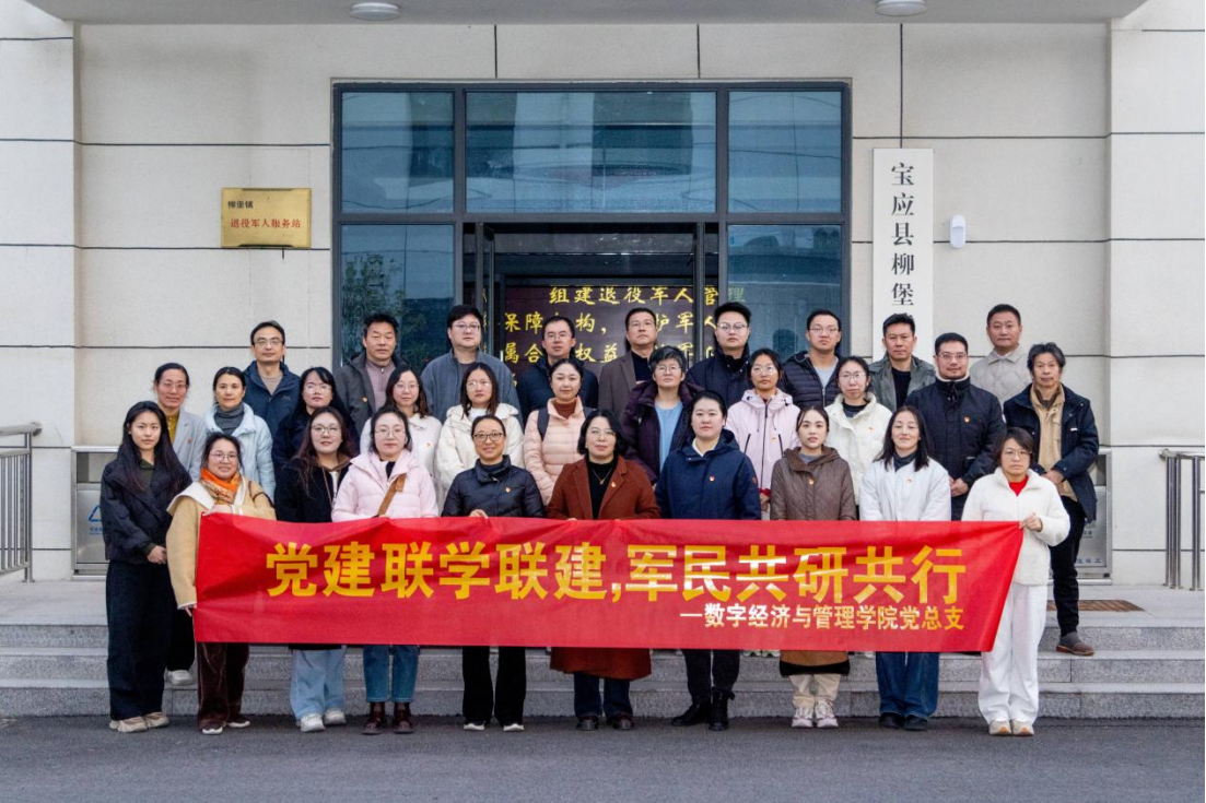 为深化校地协同育人机制,筑牢德育工作阵地,强化党建引领发展实效,2025年12月10日,数字经济与管理学院党总支组织学院全体党员同志前往宝应县柳堡镇“二妹子”模范民兵活动中心,举行校地共建协议签约、德育研学基地揭牌暨专题党课学习活动。