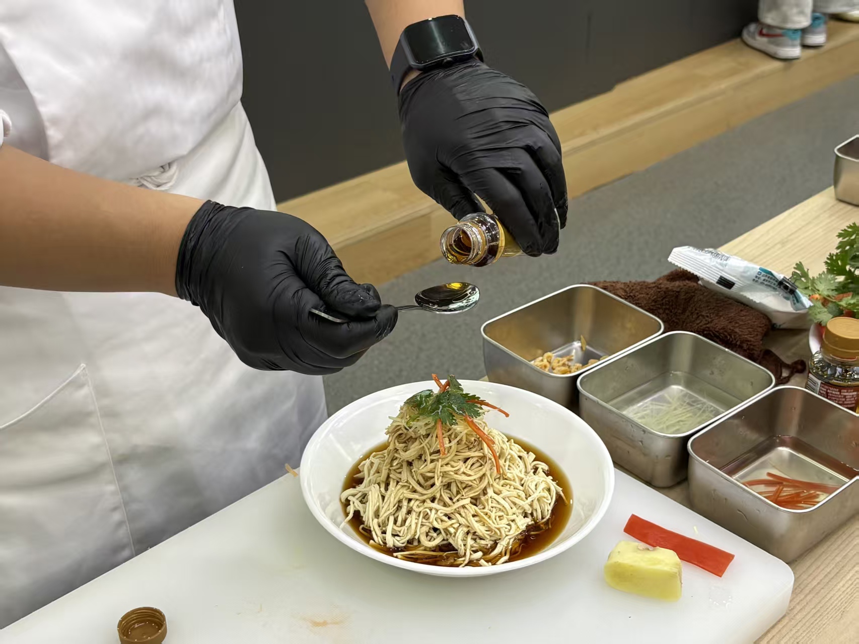 活动现场,徐老师讲解烫干丝要点:“干丝切细、焯水去腥,才有地道风味。”随后演示,干丝经处理成清爽小菜。同时,两名学生有条不紊制作饭团,将玉米等配料与米饭混合,再用海苔包裹。老人们围坐观看、拍照记录,学习氛围浓厚。