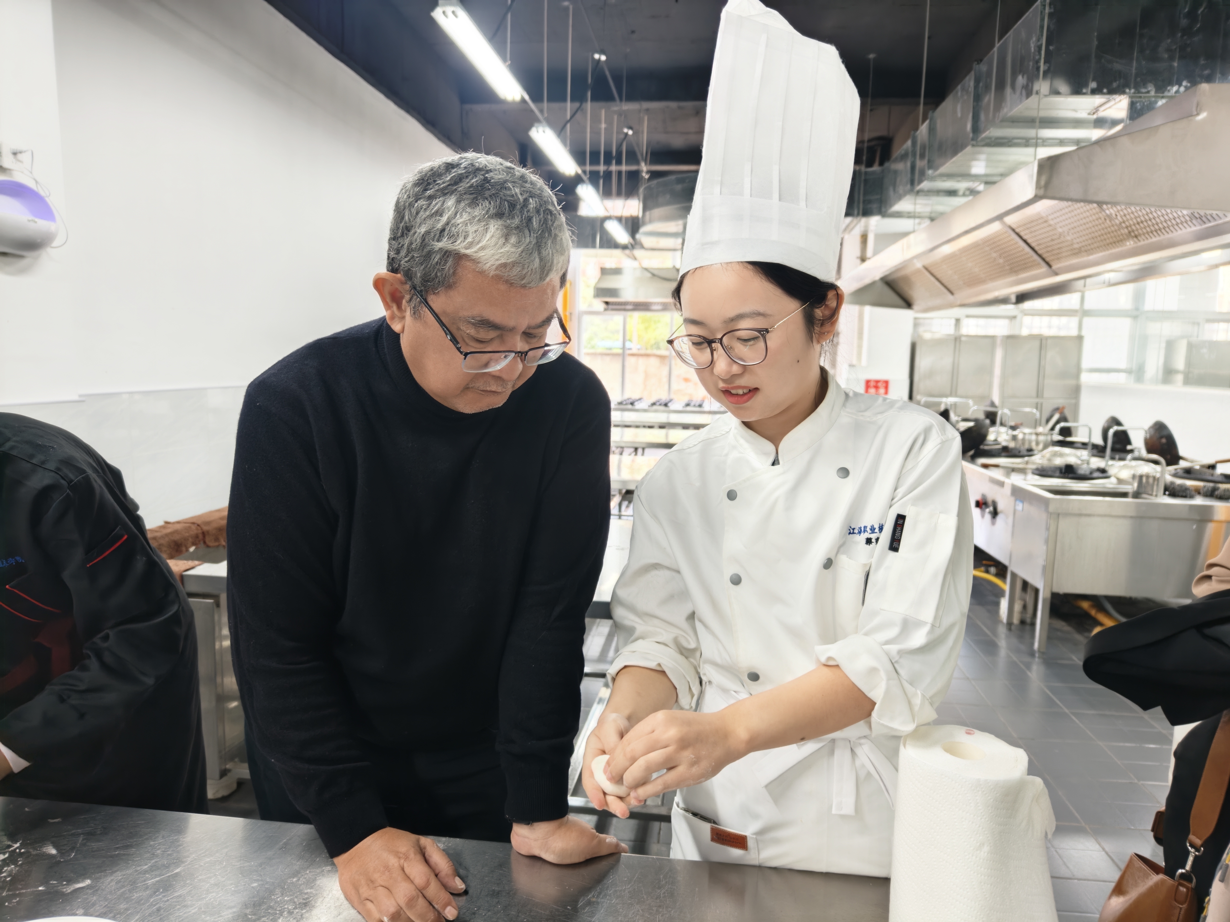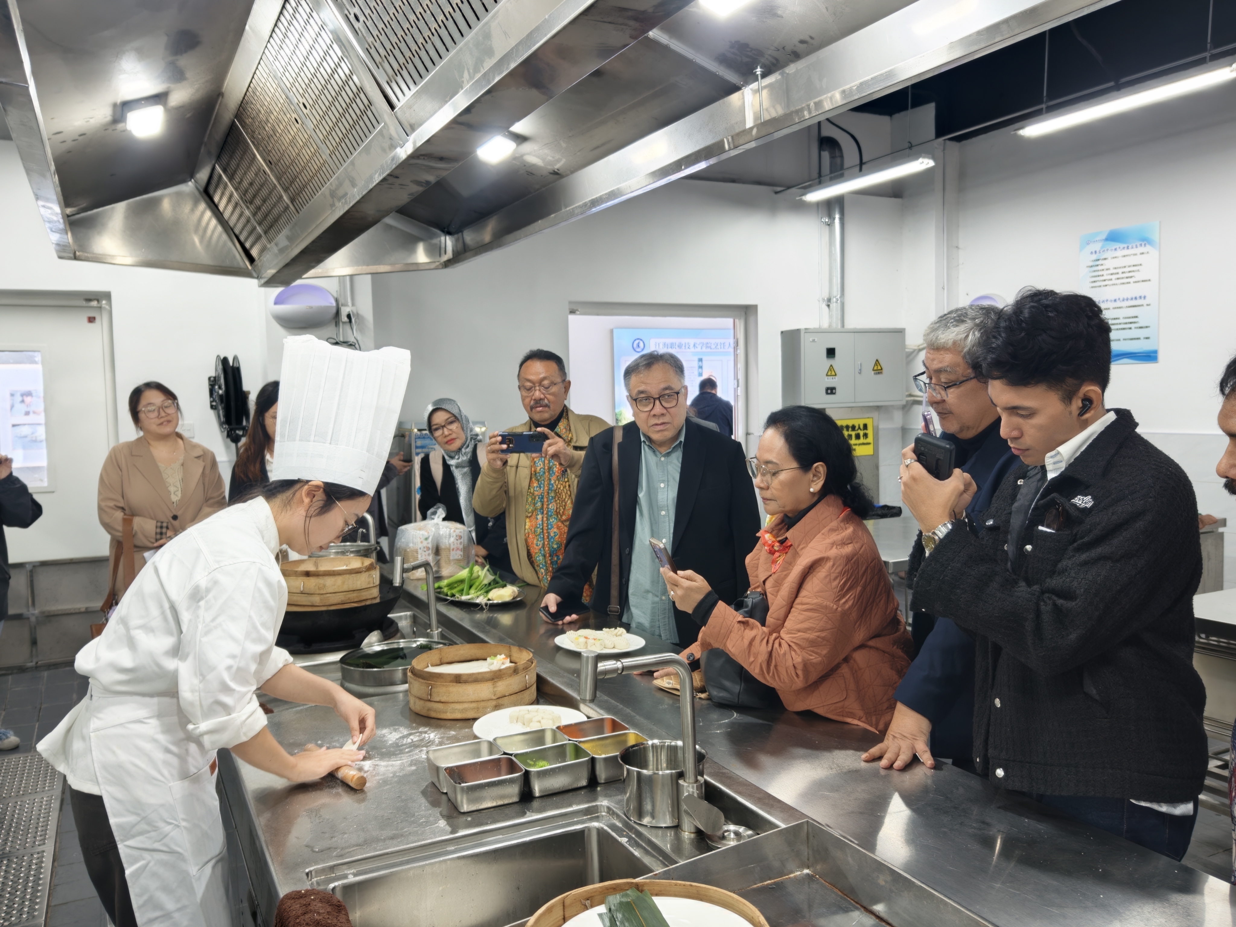 在学院领导的精心安排下,徐堃老师带领印度尼西亚代表队成员参观了学校烹饪实训室,详细讲解了实训室的设施配置、功能分区以及式烹饪教学的相关情况,让代表团直观了解我校烹饪专业的教学特色与实践优势。随后,蔡亦如老师现场演示中式面点制作技艺,从面团揉制、馅料调配到造型塑造,每一个步骤都细致入微、娴熟流畅,精湛的技艺赢得了代表团成员的阵阵赞叹。