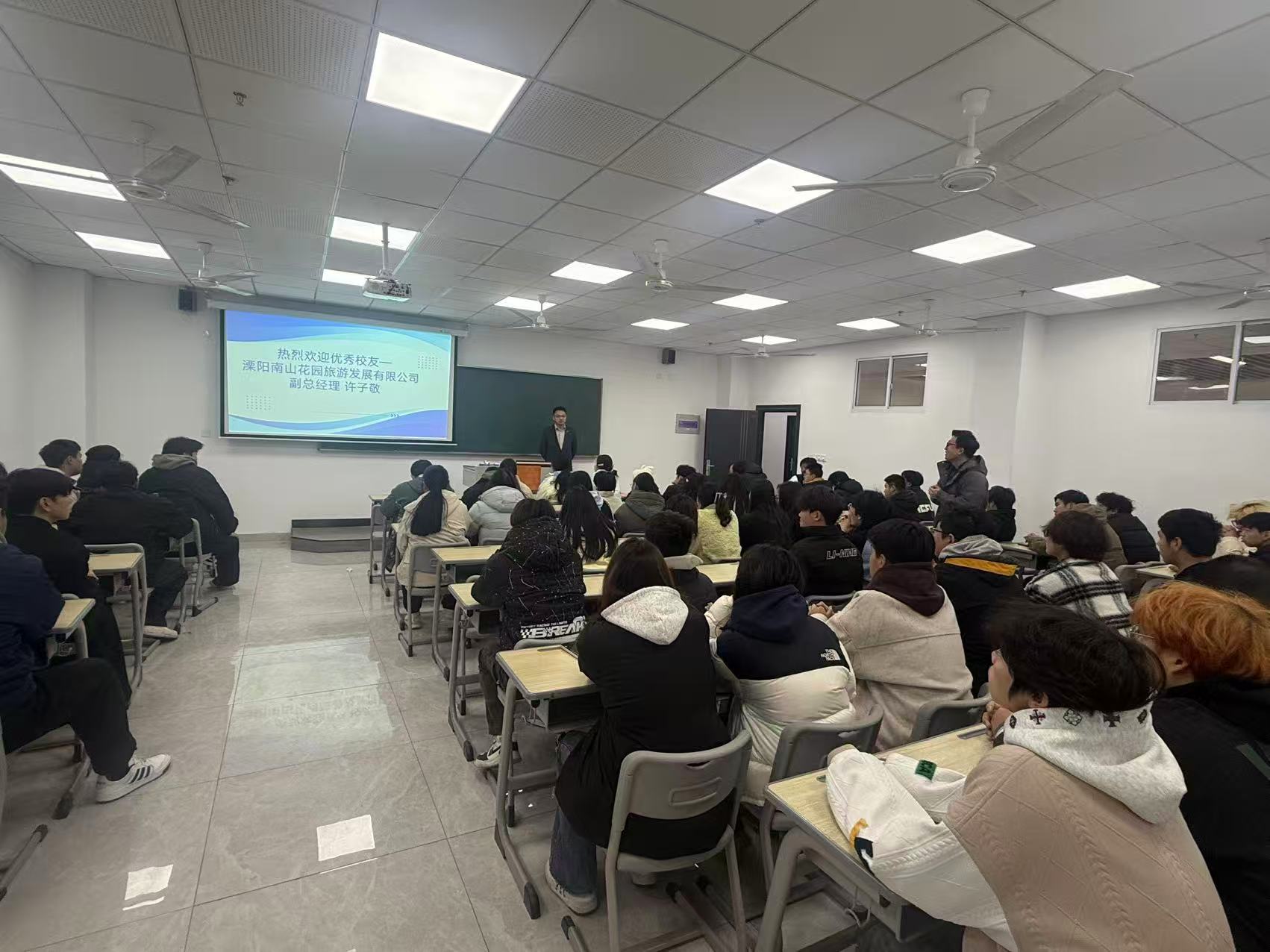 11 月 27 日,人文旅游学院特邀溧阳南山花园旅游发展有限公司副总经理、韩贸 062 班校友许子敬重返母校,为全院师生带来了一场主题鲜明、干货满满的经验分享会。人文旅游学院刘涛院长及学生代表共同参与了此次活动。