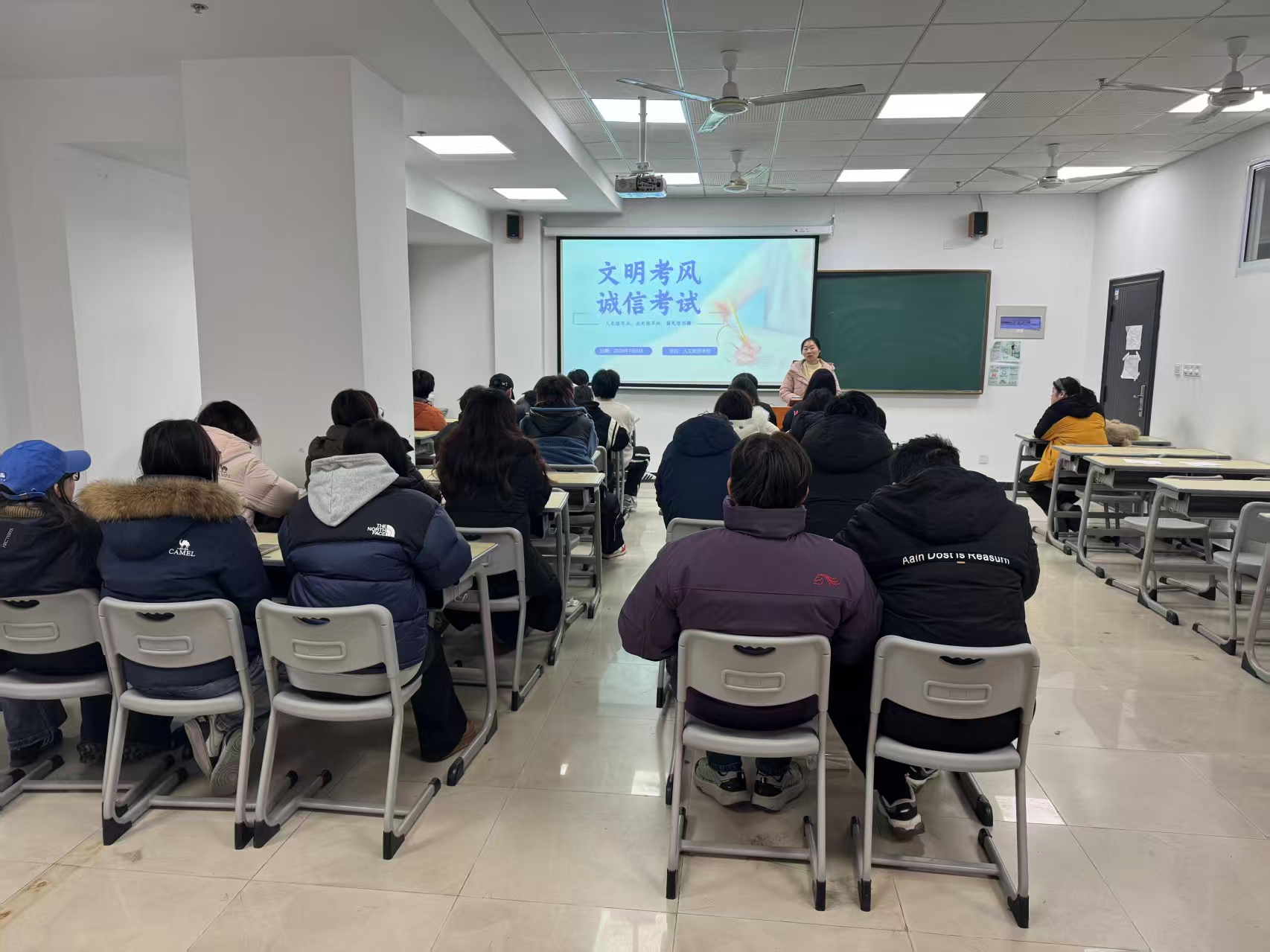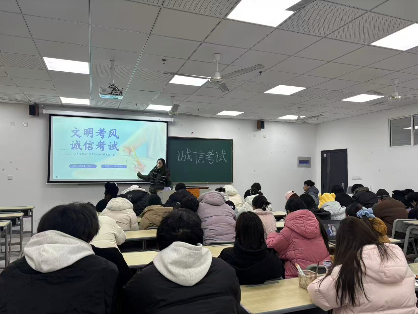 为营造公平、公正的考试环境,增强学生的诚信应试意识,于1月11日晚自习期间,人文旅游学院全组织各班级开展了诚信考试主题班会。