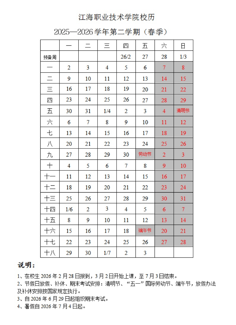 2025—2026学年第二学期(春季)校历