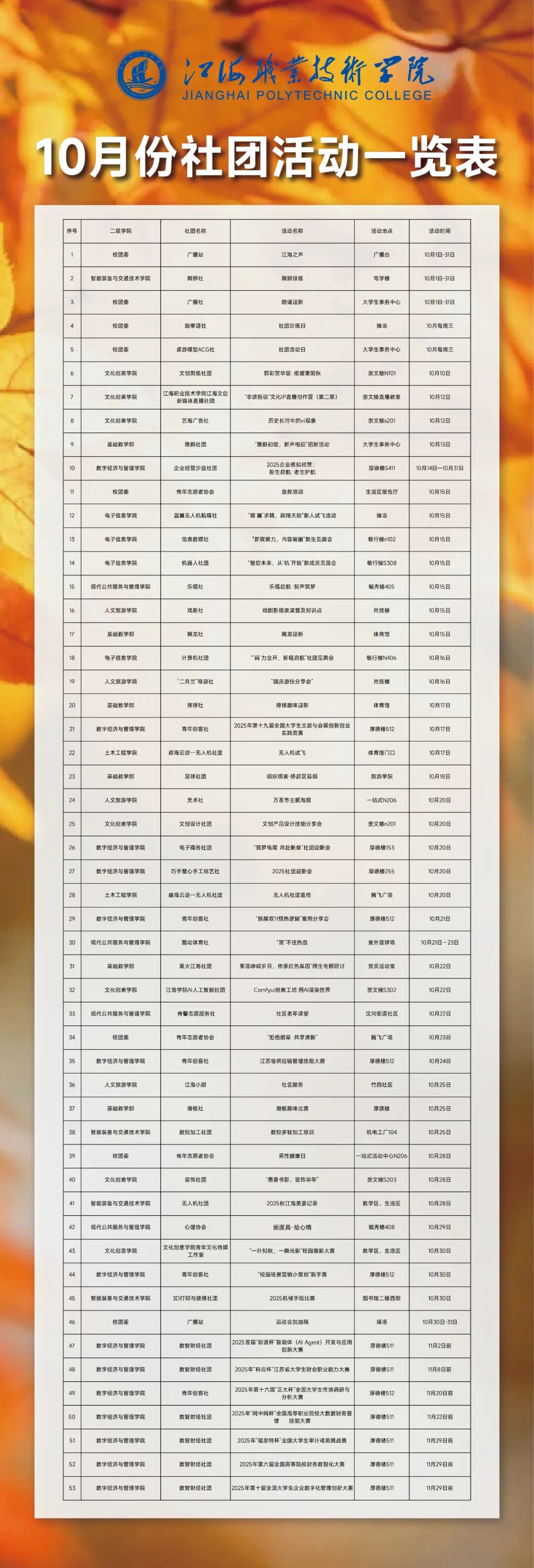 秋意渐浓,活力不减 新一段校园时光已悄然开启 校园内的各个社团 正积极筹备特色十足的活动 速览十月份社团活动预告 盼你踊跃参与,共赴秋日精彩! 十月社团活动海报 END 图文:校团委编辑:潘敏杰审核:钱洋洋