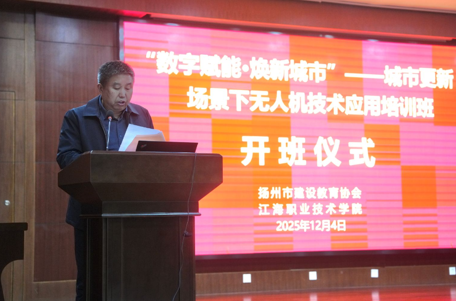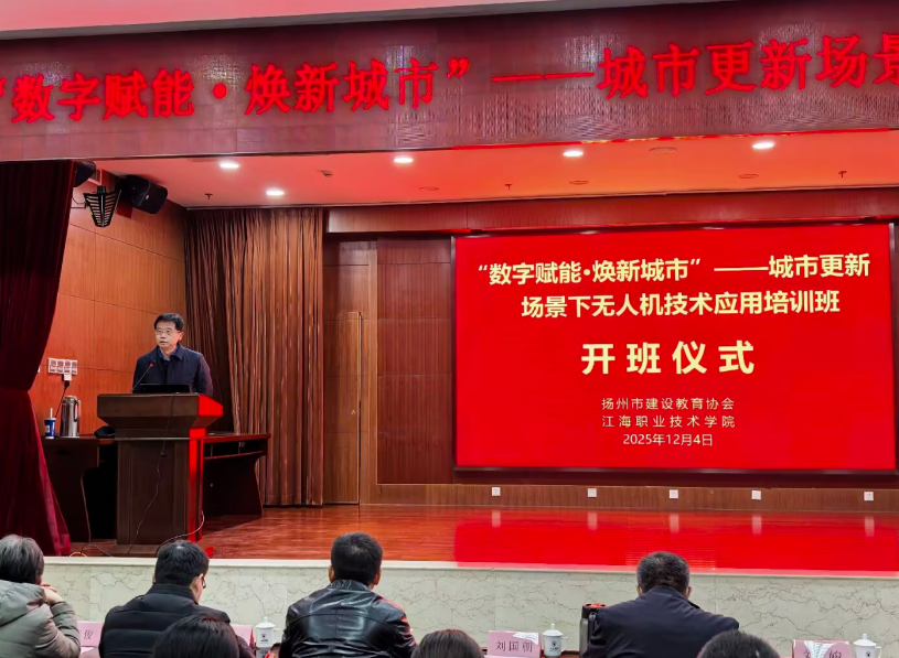 12月4日下午,由扬州市建设教育协会与土木工程学院联合主办的“数字赋能·焕新城市”——城市更新场景下无人机技术应用培训班,在江海职业技术学院顺利开班。校党委委员、副校长刘峻,扬州市住建局局机关党委专职副书记张云景出席开班仪式,扬州市建设教育协会党支部书记刘国朝主持。