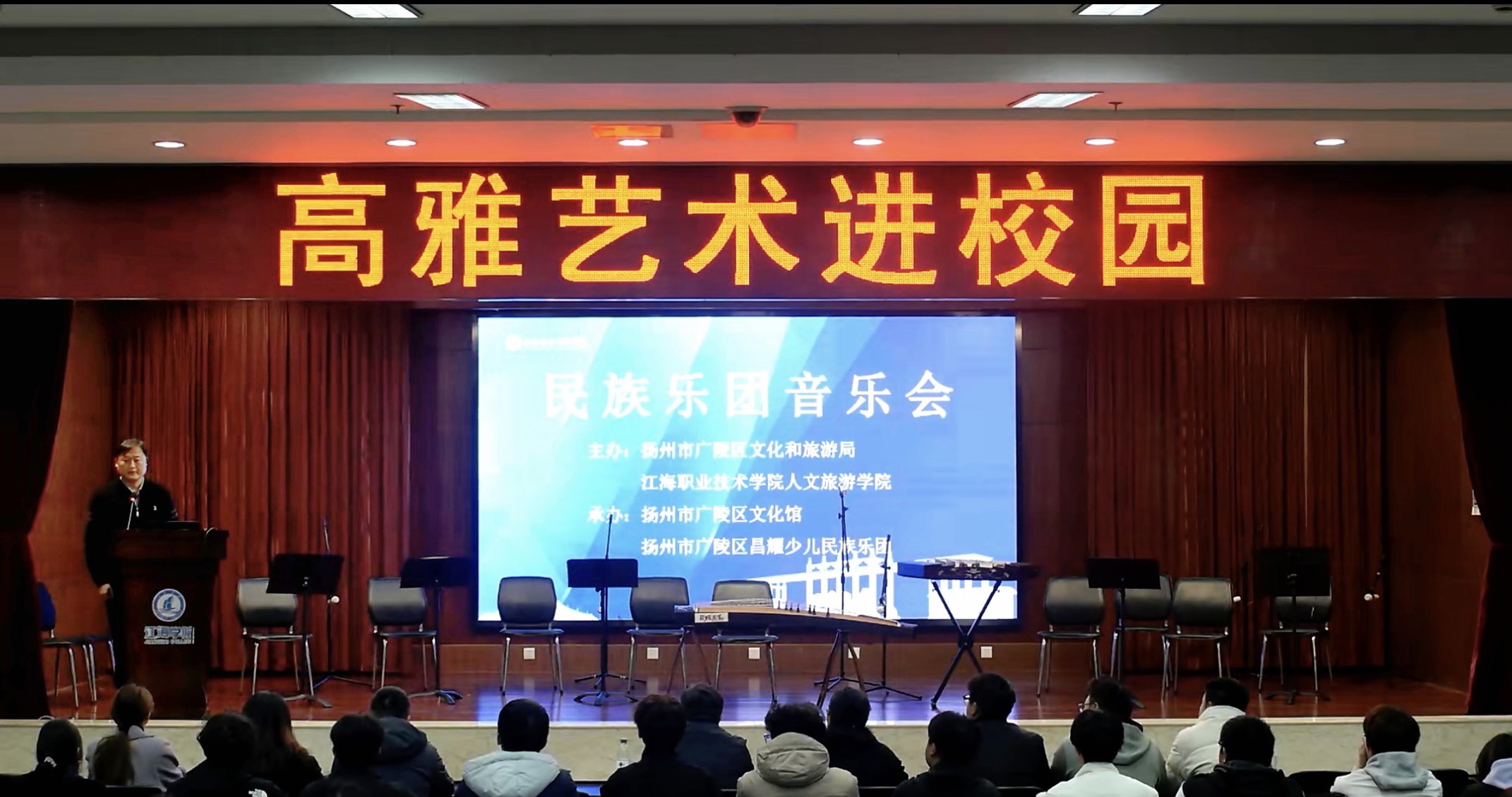 2024年11月18日,由扬州市广陵区文化和旅游局与江海职业技术学院人文旅游学院携手主办,扬州市广陵区文化馆及扬州市广陵区昌耀少儿民族乐团共同承办的“高雅艺术进校园·民族乐团音乐会”在江海职业技术学院成功举办。本次活动以传承和弘扬中华民族优秀传统文化为主题,旨在将高雅艺术引入校园,丰富校园文化生活,提升学生的艺术修养。