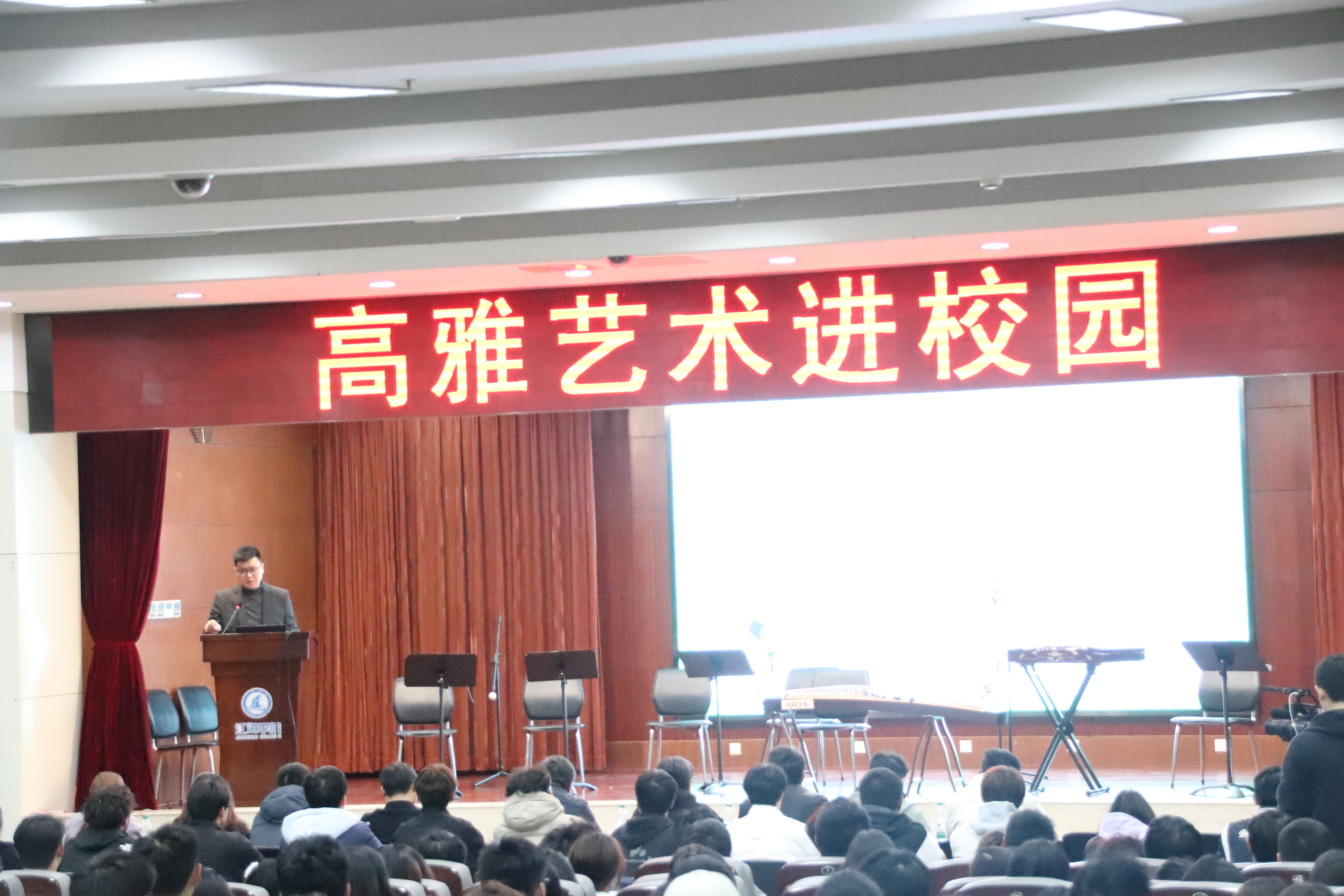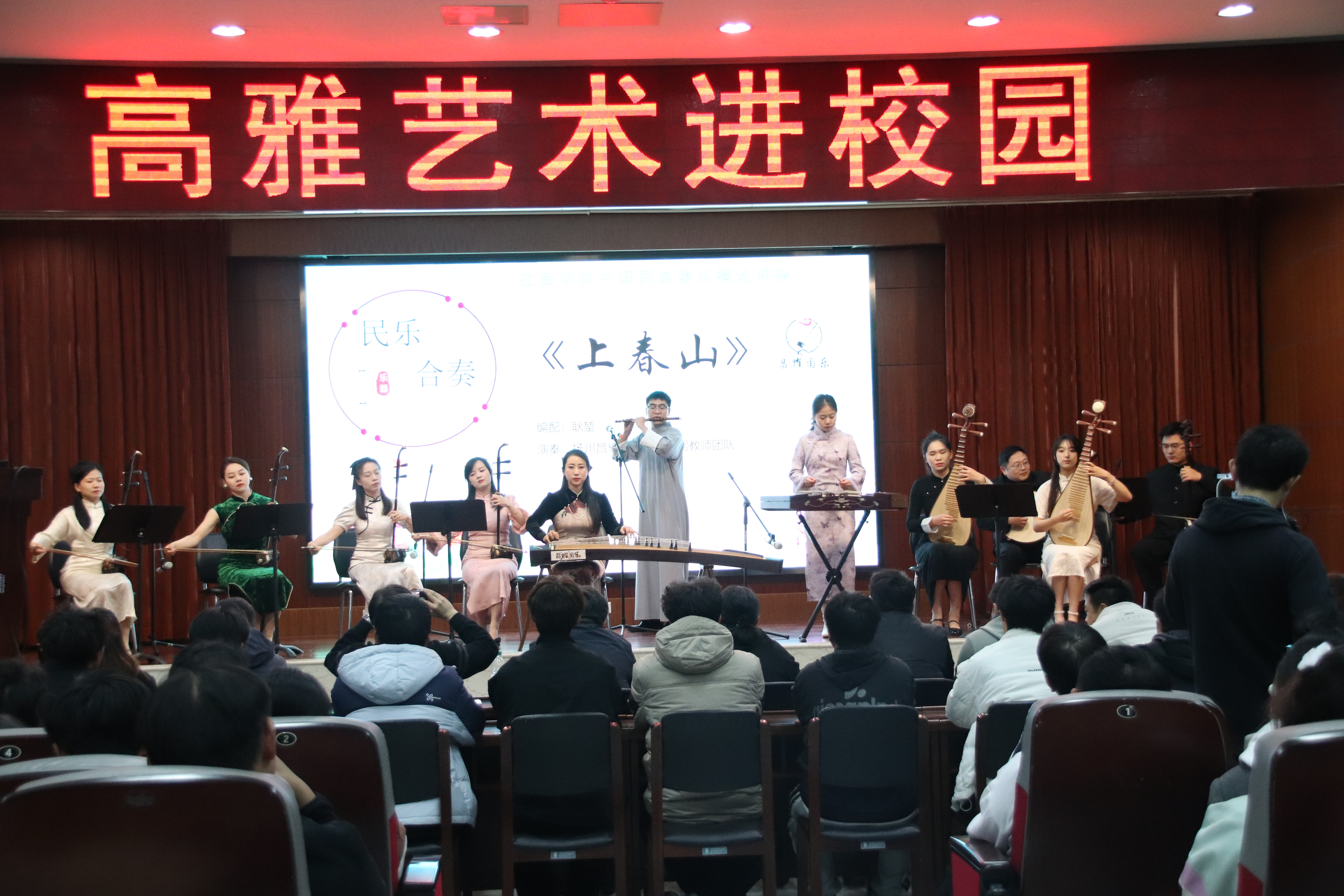 活动中,主讲嘉宾扬州朱昌耀二胡艺术学校的负责人耿堃老师,以《中国民族器乐概论》为题,围绕“中国民族乐器介绍”与“中国民族乐器赏析”两大方面,为师生们带来了一场精彩纷呈的讲座。民乐老师们也献上了一场精彩的演出,他们身着传统服饰,手指在琴弦、竹管间灵活跳跃,奏出悠扬动听的旋律。每一种乐器都以其独特的音色和表现力,展现了中国民族器乐的博大精深和独特韵味。