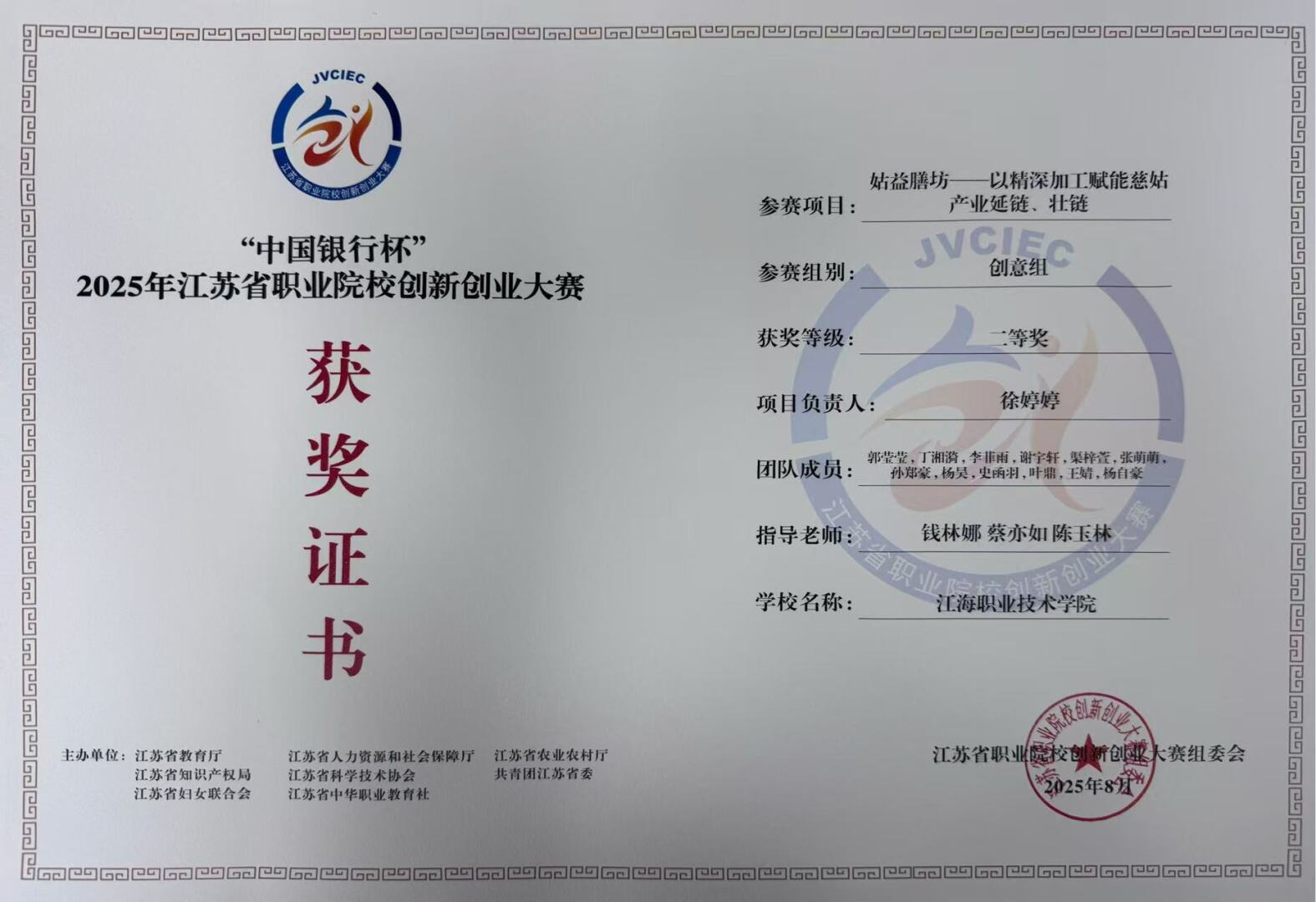 7月31日,“中国银行杯”2025年江苏省职业院校创新创业大赛在苏州工艺美术职业技术学院圆满落幕。我院教师钱林娜、蔡亦如、陈玉林共同指导的《姑益膳坊——以精深加工赋能慈姑产业延链、壮链》项目,凭借出色的创意和扎实的实践基础,荣获创意组二等奖。