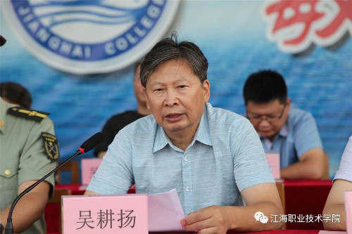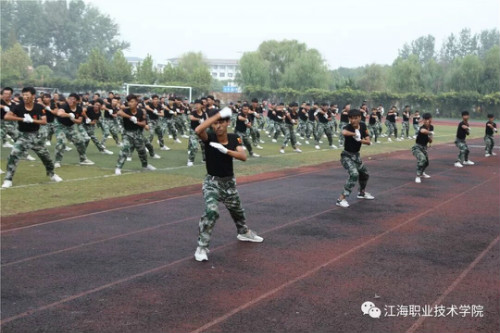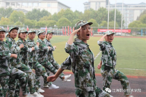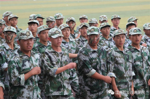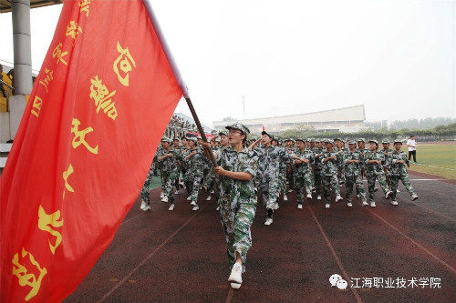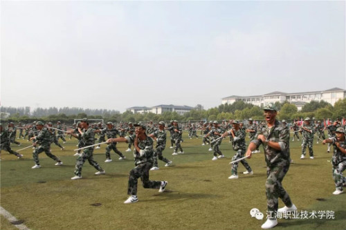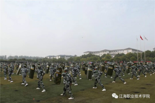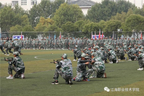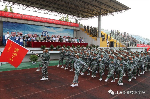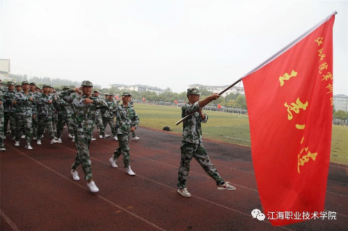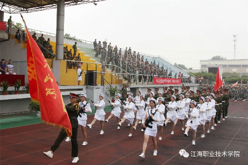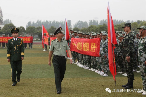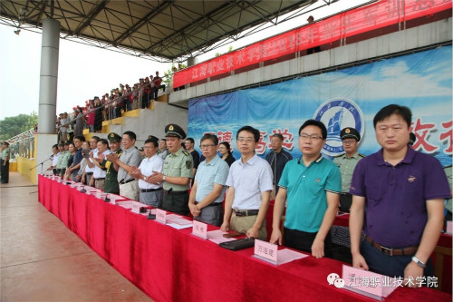 在迎、升国旗和国歌声中,军训总结大会开始。董事长、校长孙永如及校领导华国梁、余如进、陈荣华、吴耕扬、姚滨与承训团首长及学校各院部处领导,在主席台观摩同学们军训成果汇报。
