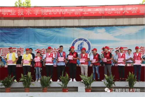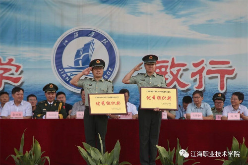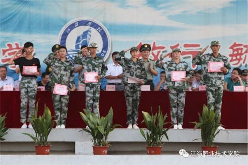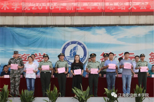 军训汇报表演结束后,副校长吴耕扬宣读了军训表彰决定,主席台领导向受表彰的先进集体(机电汽车学院、人文旅游学院)和个人、优秀教官等颁奖。