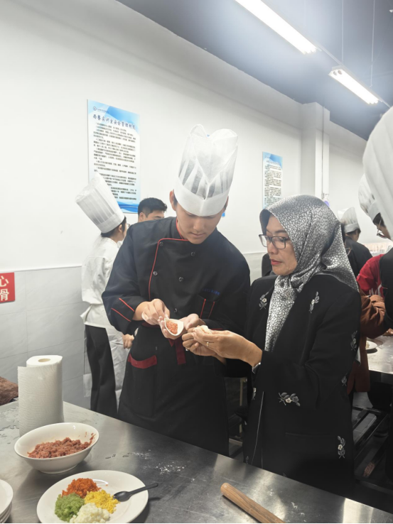 上午10时,代表团抵达我校开展实地考察,重点参观了人文旅游学院和文化创意学院。在人文旅游学院中西餐实训室,代表团成员在蔡亦如教师指导下,亲身体验中式面点制作技艺。通过参与非遗花式蒸饺制作实践,切身感受中国饮食文化精髓。随后赴文化创意学院实训室参观,现场参与漆扇绘制、剪纸等非遗工艺体验活动。朱莎莎教师就非遗技艺传承与发展作专题介绍,考察团成员积极参与互动交流。