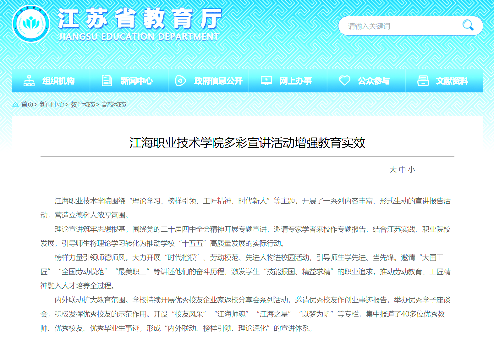 江海职业技术学院围绕“理论学习、榜样引领、工匠精神、时代新人”等主题,开展了一系列内容丰富、形式生动的宣讲报告活动,营造立德树人浓厚氛围。