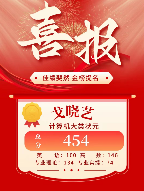 戈晓艺,在这次专转本考试中,最终以英语四级成绩590分(专转本英语成绩核算100分),高等数学146分(总分150分),专业理论134分(满分150),专业实操74分(总分100分)共计454分的总分获得了2024年江苏省专转本考试计算机类状元。