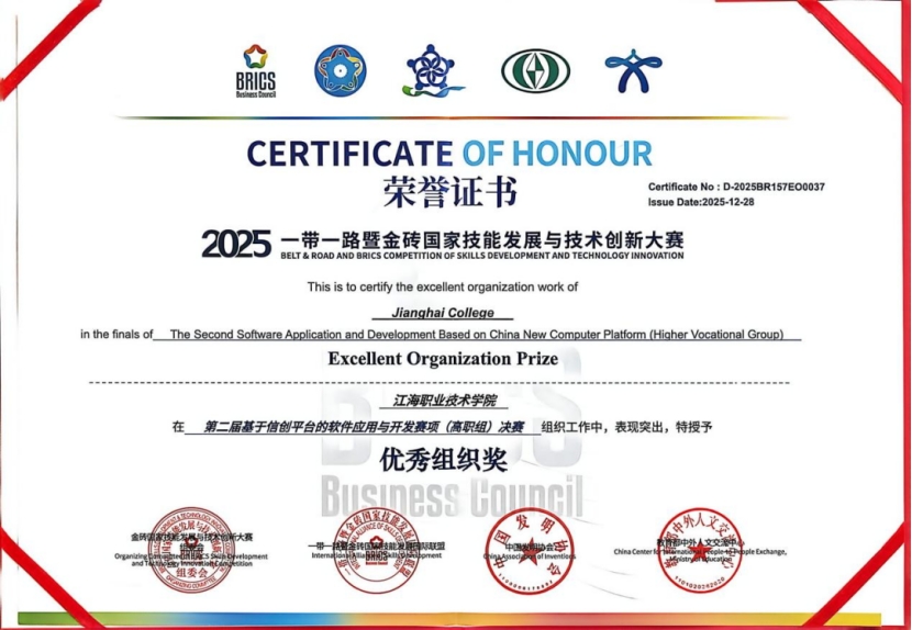 12月27日,在2025年“一带一路”暨金砖国家技能发展与技术创新大赛第二届基于信创平台的软件应用与开发赛(高职组)决赛中,我校电子信息学院韩磊老师指导的学生齐俊辉荣获国赛二等奖,学校获评优秀组织奖。