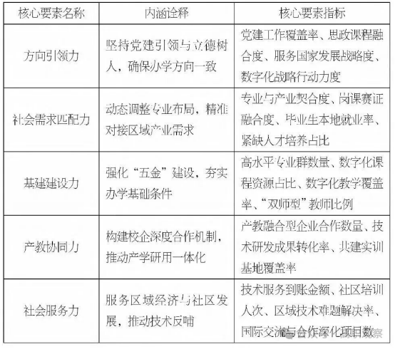 要素模型是对职业院校关键办学能力提升评价要素的高度抽象与解构。职业院校需要构建既能体现政策导向又能反映实践需求的评价要素模型,提供科学的评价工具。