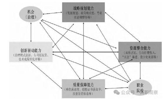 治理能力是教育现代化的核心要求。它是职业院校关键办学能力提升的重要保障。职业院校现代治理能力可提炼为图2的能力钻石模型,主要体现为:一是党政一体,谋划发展规划。职业院校要发挥党委领导下的校委会的战略引领作用,聚焦“专业群建设”“师资队伍优化”等核心问题,制定发展战略规划。建立短期量化目标(例如‘五金’建设)与长期质效目标(例如毕业生就业质量)相结合的规划框架,以有效破解产教融合过程中面临的政策与资金瓶颈问题。二是治理模式创新,跨部门协同育人。职业院校应构建“专业建设—师资发展—治理创新”三位一体能力体系,形成“战略牵引—数字赋能—动态迭代”治理新范式。建立“政府主导—企业指导—院校主体—企业参与”联动机制,成立“市域产教联合体”或“产教融合共同体”,形成“政产学研用”协同创新生态。三是教育资源融合,推动数智驱动管理。职业院校应强化教育资源融合,建立“四共”(规划共商、标准共建、资源共用与质量共评)资源建设机制,加强数字校园建设。整合教学资源、实训数据及就业信息,实现办学质量动态监测。通过“月度督查—季度扫描—年度诊断”制度,利用大数据进行深度挖掘分析,为办学决策提供科学依据。四是质量管理推动,文化赋能培养。将企业文化融入校园文化,塑造学生工匠精神与职业认同,培养“红色工匠”,重视用人单位满意度与技能证书获取率,构建“五方评价”(政府、行业、企业、院校与学生)现代质量管理体系,全面落实立德树人根本任务,为社会输送高素质技能人才。(节选自《教育科学论坛》2025年第33期)