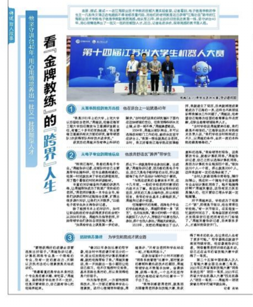 第二十五届中国机器人及人工智能大赛全国总决赛二等奖、2023年江苏省高职技能大赛“网络系统应用”项目—个奖、2023年江苏省大学生机器人大赛“四足机器人”项目一等奖……周越用一项项荣誉为同学们铺平就业路。