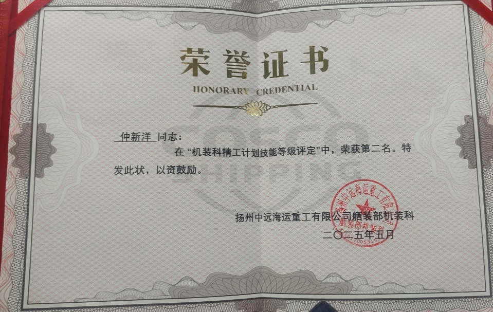 仲新洋入职后扎根舾装部机装科钳工运输组,以“精工技艺助力船舶制造提质增效”为目标,凭借扎实的专业技能和精益求精的态度,为生产流程优化贡献力量。实习期间,他深度参与船舶核心部件装配,积极投身工装改进与流程优化,有效提升作业效率、节省时间成本;在1205船设备联络与安装任务中,他全程跟踪流程,积累了丰富的现场管理经验,实现了个人能力的快速提升,还在科室首届钳工精工培训中荣获第二名。未来,他将继续深耕专业,提升班组管理能力,为企业高效运转添力。