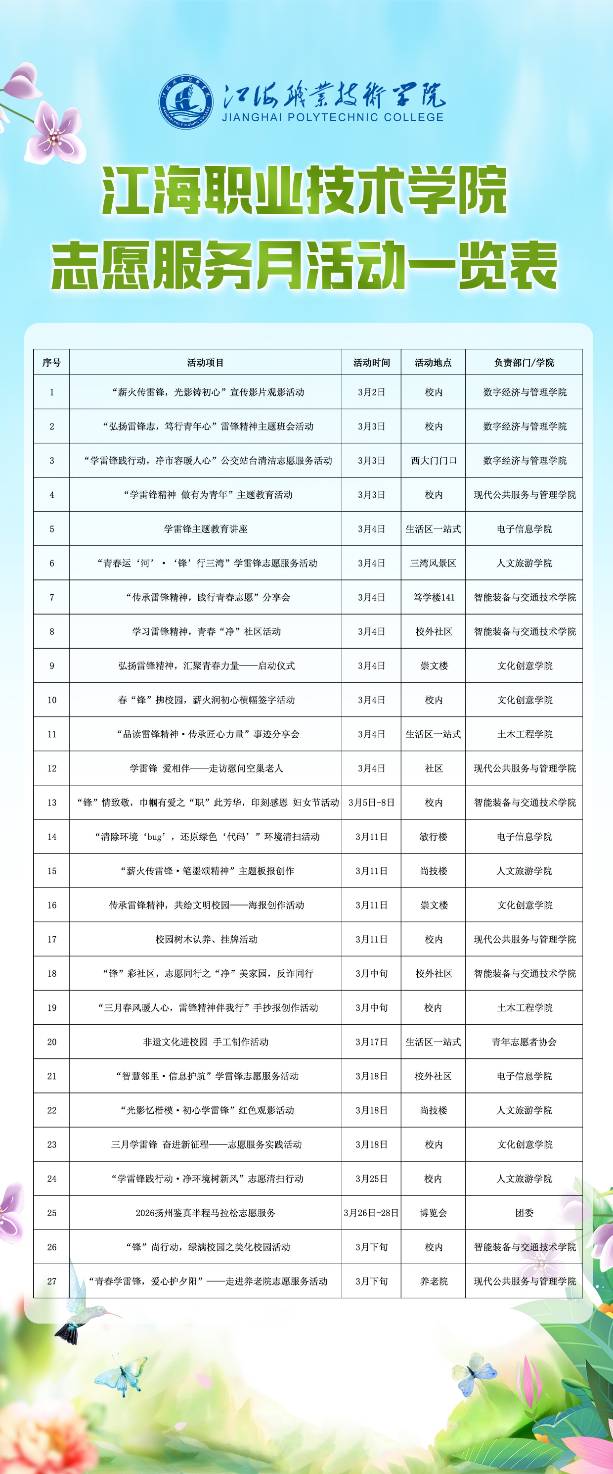 3月4日,学院组织学生志愿者走进扬州三湾风景区及大运河博物馆周边,开展“青春运‘河’‘锋’行三湾”学雷锋日主题志愿服务活动。“运河清道夫”小分队手持工具,沿河岸步道捡拾烟头、纸屑等杂物,以实际行动守护运河生态底色;“运河百事通”小分队则发挥旅游管理、空乘等专业优势,在景区入口及主要路口为游客提供路线指引、预约协助以及扬州旅游咨询。此次活动将劳动教育、专业实践与志愿服务深度融合,美化景区环境,让学子们在服务社会中收获了成长。