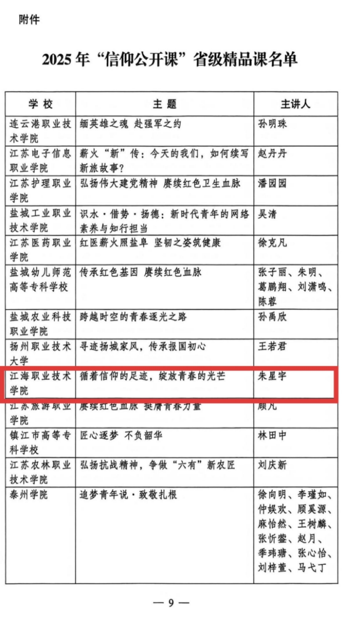 近日,共青团江苏省委2025年“信仰公开课”省级精品课评选结果揭晓,由我校团委报送的《循着信仰的足迹,绽放青春的光芒》成功入选。