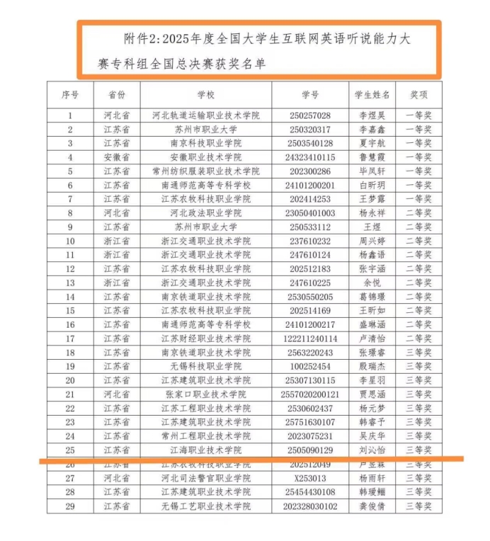 近日,2025年全国大学生互联网英语听说能力大赛全国总决赛在南京林业大学落下帷幕。我校数字经济与管理学院会计2501班刘沁怡同学,凭借扎实的语言功底和沉稳的临场发挥,荣获全国总决赛(专科组)三等奖,是本届赛事中全国唯一一位在该项目获奖的民办高职院校学生。